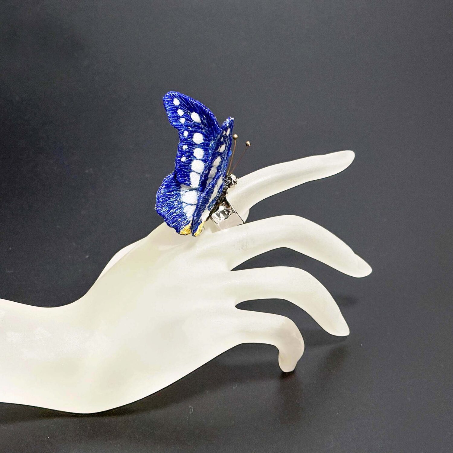 そして、立体刺繍Sayokoの蝶は、額のお好きな場所に留まらせてアートとして楽しむことも、また、肩や指輪に留まらせて身に着けるジュエリーとして楽しむこともできます。